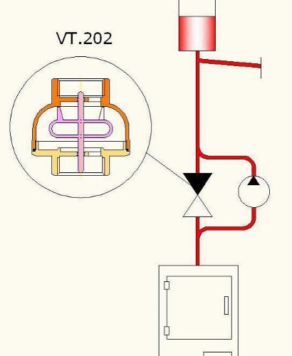 Рис. 8. Воздушная трубка с гидрозатворомМиф 7. Насос, установленный на байпасе главного стояка, не создаст эффекта циркуляции, т.к. установка запорной арматуры на главном стояке междукотлом и расширительным баком запрещена. Можно поставить насос на байпасе обратной линии, а между врезками насоса установить шаровой кран. Такое решение не очень удобно, т.к. каждый раз перед включением насоса надо не забыть перекрыть кран, а после выключения насоса – открыть. Установка обычного пружинного обратного клапана невозможна из-за его значительного гидравлического сопротивления. Домашние мастера пытаются препарировать обратные клапаны, снимая с них пружинки совсем или устанавливая их «наоборот» (превращая клапан в нормально открытый). Такие переделанные клапаны создадут в системе неповторимые звуковые эффекты из-за постоянного «хлюпанья» с периодом, пропорциональным скорости теплоносителя.Есть гораздо более эффективное решение: на главном стояке между врезками байпаса устанавливается поплавковый обратный клапан для гравитационных систем VT.202 (рис. 9), который скоро появится в ассортименте VALTEC. Поплавок клапана в режиме естественной циркуляции открыт и не мешает движению теплоносителя. При включении насоса на байпасе клапан перекрывает главный стояк, направляя весь поток через байпас с насосом.