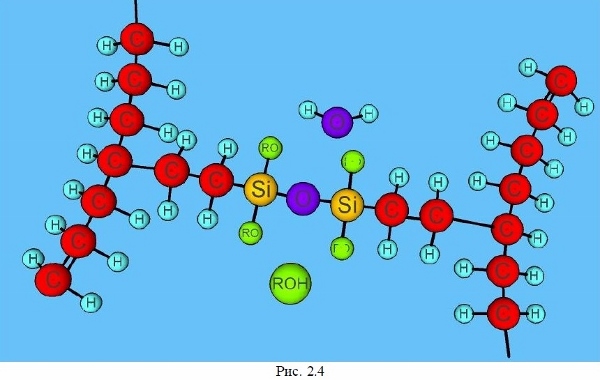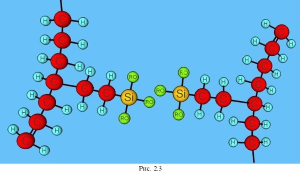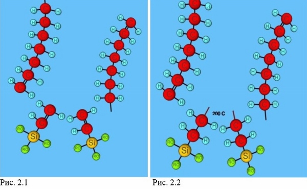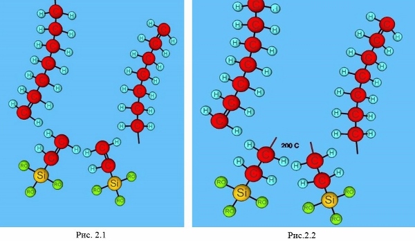 В настоящее время для производства PEX-труб по методу «b» в основном используется винилтриметаксилоксан (H2C=CH)Si(OR)3 (рис. 2.1). При нагревании связи винильной группы разрушаются, превращая его молекулы в активные радикалы (рис. 2.2). Эти радикалы замещают атом водорода в макромолекулах полиэтилена (рис. 2.3). Затем полиэтилен обрабатывают водой либо водяным паром, органические радикалы при этом присоединяют молекулу водорода из воды и образуют стабильную гидроокись (органический спирт). Соседние радикалы полимера замыкаются через связь Si-O, формируя пространственную решётку (рис. 2.4). Вытеснение воды из PEX ускоряется при помощи оловянного катализатора. Процесс окончательной сшивки происходит уже в твёрдой стадии изделия.