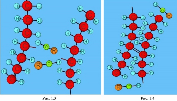 Для получения PEX по методу «а» полиэтилен перед экструдированием расплавляется вместе с антиокислителями и пероксидами (процесс Томаса Энгеля), рис. 1.1. С повышением температуры до 180–220 ºС пероксид разлагается, образуя свободные радикалы (молекулы со свободной связью), рис. 1.2. Радикалы пероксидов забирают у атомов полиэтилена по одному атому водорода, что приводит к образованию свободной связи у атома углерода (рис. 1.3). В соседних макромолекулах полиэтилена атомы углерода, имеющие свободные связи, объединяются (рис. 1.4). Количество межмолекулярных связей составляет 2–3 на 1000 атомов углерода. Процесс требует жесткого контроля за температурным режимом в процессе экструзии, когда происходит предварительная сшивка, и в ходе дальнейшего нагревания трубы.