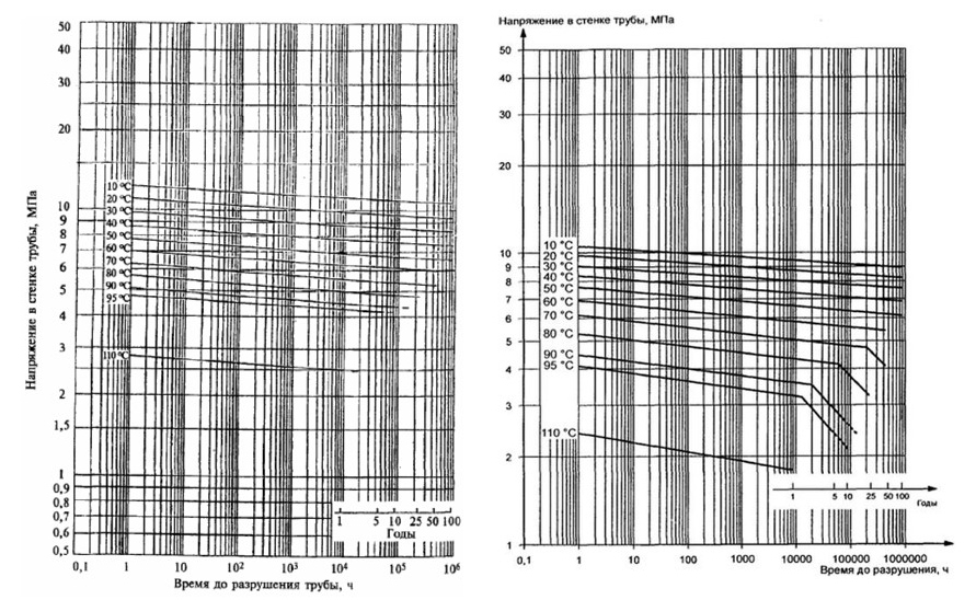 Рис. 7. Эталонные кривые длительной прочности труб из PEX (слева) и PERT (справа)
