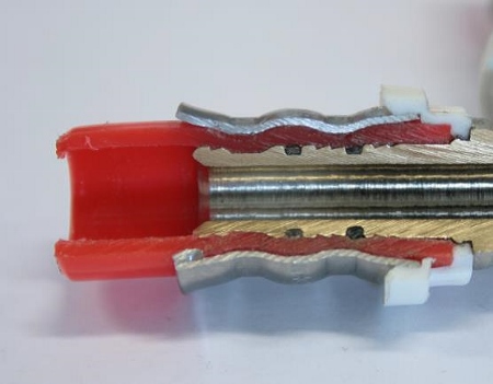 Первое кольцо (на рис. 12 слева) находится вне зоны обжатия пресс-инструмента. Оно служит для обеспечения герметичности при небольших смещениях фитинга во время эксплуатации (такие смещения могут быть вызваны температурными колебаниями). Модуль упругости EPDM (материала, из которого сделана уплотнительная резинка) во много раз меньше модуля упругости PEX, поэтому этот материал в таких случаях заполняет все пустоты, образовавшиеся в результате смещения фитинга.