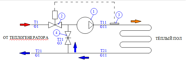 Нагретый теплоноситель поступает на вход насосно-смесительного узла от котла или стояка радиаторной системы отопления с температурой T1. На входе в узел установлен настраиваемый термостатический клапан 2, на приводе которого выставляется требуемая температура теплоносителя, поступающего в тёплый пол Т11. Термочувствительный элемент 3 привода клапана располагается после насоса 1. При повышении температуры Т11 выше настроечного значения, клапан 2 закрывается, а при понижении – открывается, пропуская горячий теплоноситель на вход насоса. Пройдя по петлям тёплого пола, теплоноситель остывает до температуры Т21. Часть остывшего теплоносителя возвращается к котлу, а часть – через балансировочный клапан 4 поступает на вход насоса, смешиваясь с горячим теплоносителем.