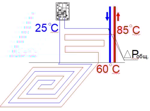 где Q — тепловая мощность системы, Вт; с — удельная теплоёмкость теплоносителя, Дж/кг °С; ∆Т — разность температур между прямым и обратным теплоносителем, °С.В системах радиаторного отопления перепад температур ∆Т обычно составляет порядка 20 °С, а в системах напольного отопления ∆Т = 5–10 °С.