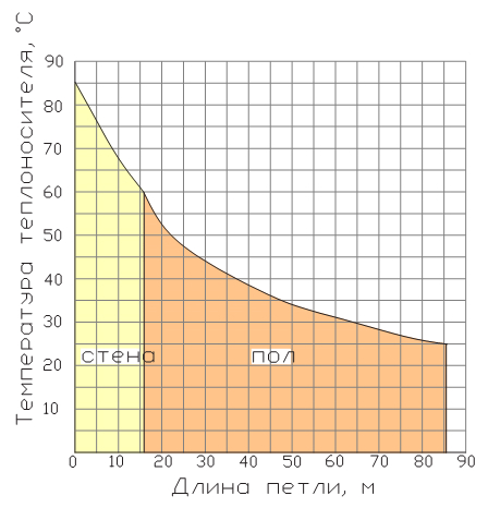 Если для полов допустимая температура их поверхности ограничена 35 °С, то для стен это значение составляет 70 °С, поэтому остывание теплоносителя в стенах идёт гораздо быстрее, чем на полу (рис. 11).