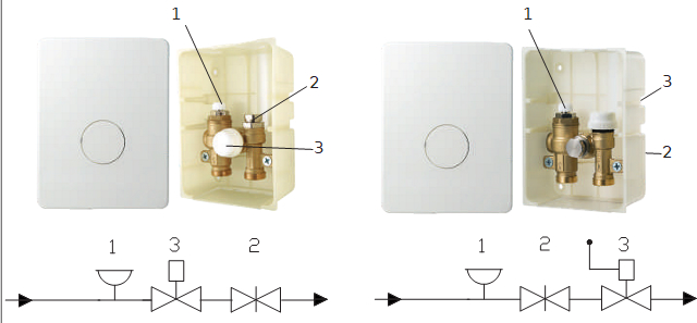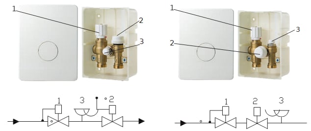 На схемах рис. 12 позицией 1 обозначен ручной воздухоотводчик, позицией 2 – балансировочный клапан и позицией 3 – термостатический клапан. Термостатический клапан модуля VT.ICBOX.4 регулируется обычной термоголовкой VT.5000. Узел VT.ICBOX.5 управляется термоголовкой с выносным термочувствительным элементом VT.5010.