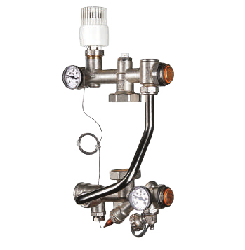 Конструкция узла предусматривает перепускной контур с балансировочным клапаном, сохраняющим неизменным расход теплоносителя в первичном контуре при перекрытии петель тёплого пола.