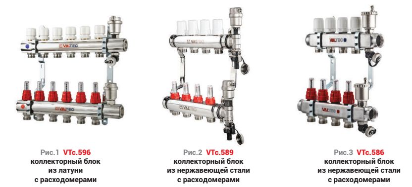 Так же балансировка отличается в зависимости от того, имеет ли коллекторный блок расходомеры. Коллекторные блоки VTc.596 (рис. 1), VTc.589 (рис. 2), VTc.586 (рис. 3) оснащены расходомерами, которые значительно ускоряют балансировку и позволяют её осуществить без включения котла, так как показывают в реальном времени расход воды по каждому направлению.