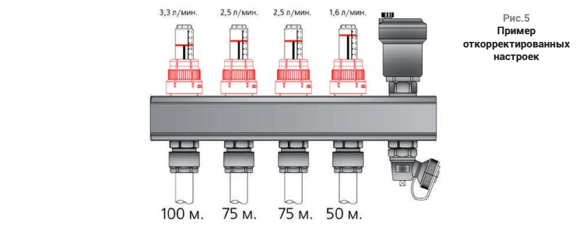 В этом случае настройка начинается с первой петли, имеющей длину 100 м. Она открывается на максимум. Предположим, что при полностью открытом клапане расход на этой петле установился на уровне 4 л/мин.