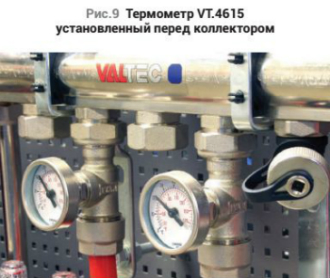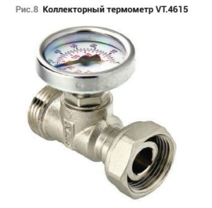 Оценку температуры удобнее всего делать при помощи специального термометра, такого как VT.4615 (рис. 8). Такой термометр вставляется между трубой и обратным коллектором через соединение «евроконус» (рис. 9).