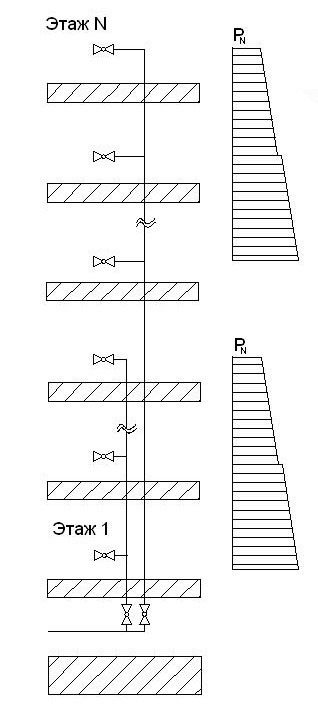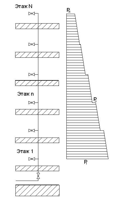 Рис. 2. Распределение давления в водопроводе многоэтажного дома с зонированием