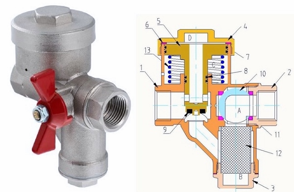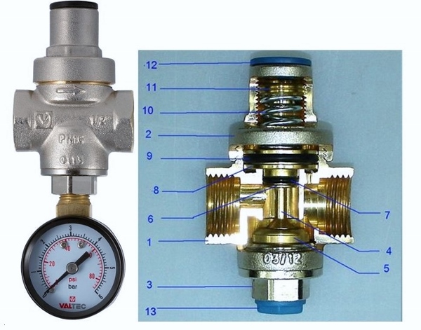 Рис. 7. Внешний вид и конструкция крана с фильтром и редуктором давления VT.298: 1 – большой полукорпус, 2 – малый полукорпус, 3 – пробка, 4 – заглушка, 5 – шток с поршнем, 6 – прокладка, 7 – уплотнительноекольцо, 8 – уплотнительное кольцо, 9 – золотниковая прокладка, 10 – затвор шаровой, 11 – кольцо седельное, 12 – фильтроэлемент, 13 – пружина