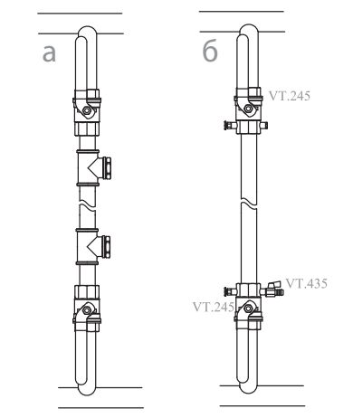На кран, установленный внизу стояка вместо пробки рекомендуется устанавливать дренажный кран VT.435 (1/4″), что сделает обслуживание стояка ещё более удобным (рис. 9, б).
