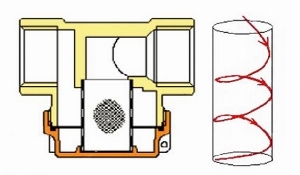 Конструкция прямых фильтров такова, что поток рабочей среды при входе в фильтроэлемент поворачивает на 90°, создавая турбулентный вихрь, омывающий сетку (рис. 6. Это способствует более эффективной очистке, препятствуя нарастанию на сетке коллоидных и волокнистых частиц. В процессе очистки задействована одновременно вся площадь фильтроэлемента. Прямые фильтры VALTEC снабжены фильтроэлементами с размерами ячеи 300 мкм, что является оптимальным для защиты от засорения квартирных редукторов давления, водосчетчиков, термостатов, смесителей и прочей водоразборной арматуры.