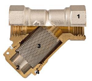 Рис. 2. Косые фильтры грубой очистки (слева направо): VT.192, VT.191, VT.190. Все модели косых фильтров VALTEC могут использоваться в трубопроводных системах с максимальной температурой рабочей среды до 150 °С. Фильтрующая способность для моделей диаметром до 1" составляет 500 мкм. Фильтр состоит (рис. 3) из корпуса 1 (горячепрессованная никелированная латунь CW617N), латунной пробки 2, фильтроэлемента 3 (нержавеющая сталь AISI 316) и тефлоновой прокладки 4. Пробка фильтра имеет пломбировочное отверстие, необходимое при установке этого элемента перед водосчетчиком. Обслуживание косого ФГО заключается в периодической очистке фильтроэлемента. Для этого необходимо открутить пробку и извлечь фильтроэлемент для очистки и промывки.