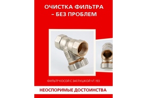 Еще одной инновацией, внедренной там, где ничего нового, казалось бы, уже не придумаешь, стало оснащение косого фильтра VT.193.N заглушкой вместо вкручиваемой пробки. Фильтровальная колба такой новинки имеет наружную, а не внутреннюю резьбу. Попадание в нее рабочей среды и мельчайшего шлама исключено, а значит исключена и возможность «прикипания» заглушки. (Ситуация, когда выкрутить пробку фильтра проблематично, – обычное дело.) От своих «собратьев» фильтр отличается также большим углом между осями колбы и трубопровода (60, а не 45°), что повышает степень очистки за счет увеличения турбулентности потока в колбе.