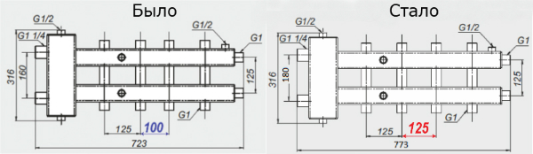 Принимая во внимание отзывы специалистов, работающих с продукцией VALTEC непосредственно на объектах, производитель внес изменение в конструкцию гидроразделителя с коллектором VTc.100.SH на пять отопительных контуров (модель VTc.100.SH.070605). Межосевое расстояние между парами выходов увеличено со 100 до 125 мм.