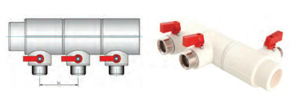 Из таких тройников можно собирать коллекторы с любым количеством выходов, шаг между которыми составляет 54 мм.