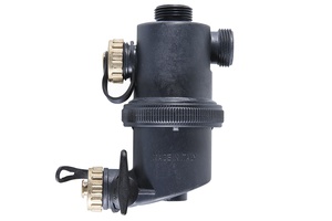 Арсенал средств механической очистки будет «подкреплен» промывным магнитным шламоуловителем VT.383. Кроме фильтрующей сетки он оснащен погружным ниодиевым магнитом, задерживающим железосодержащие примеси, всегда меньшие размера ячейки фильтроэлемента (800 мкм). Магнит помещен в пластиковую гильзу, извлекается из нее без слива воды. При этом налипшие на гильзу частицы оседают в фильтровальной камере и легко удаляются при открытии дренажного шарового крана. Шламоуловитель устанавливается в любом монтажном положении и используется для очистки воды температурой до 90 °C.