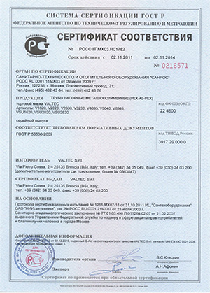 Орган по сертификации санитарно-технического и отопительного оборудования «Санрос», аккредитованный Федеральным агентством по техническому регулированию и метрологии РФ, выдал новый сертификат на металлополимерные трубы VALTEC (PEX-Al-PEX). Документ подтверждает соответствие продукции требованиям ГОСТ 53630-2009 «Трубы напорные многослойные для систем водоснабжения и отопления. Общие технические условия». Сертификат получен на основании испытаний в ИЦ «Сантехоборудование» ОАО «НИИсантехники». Срок действия – до 2 ноября 2014 года.