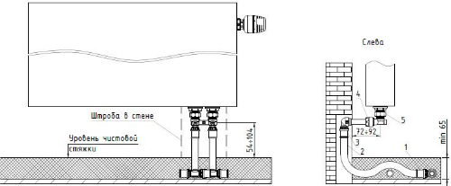 Особенность новинки – угловое расположение относительно друг друга патрубков присоединения к отопительному прибору и трубной разводке – упрощает так называемое тыльное подключение отопительного прибора – при скрытых в стене подводящих трубах (так, как это показано на рисунке ниже).