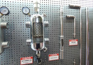 Из нержавеющей стали выполнена и другая новинка – гидравлический разделитель VT.VAR05.SS. Цена его существенно ниже, чем у бронзового VT.VAR00.G, а в саму конструкцию внесены усовершенствования: добавлены сепаратор, ускоряющий удаление газов из теплоносителя, перфорированная перегородка, которая обеспечивает снижение теплопотерь в «гидрострелке» с примерно 7 до 2–3%.