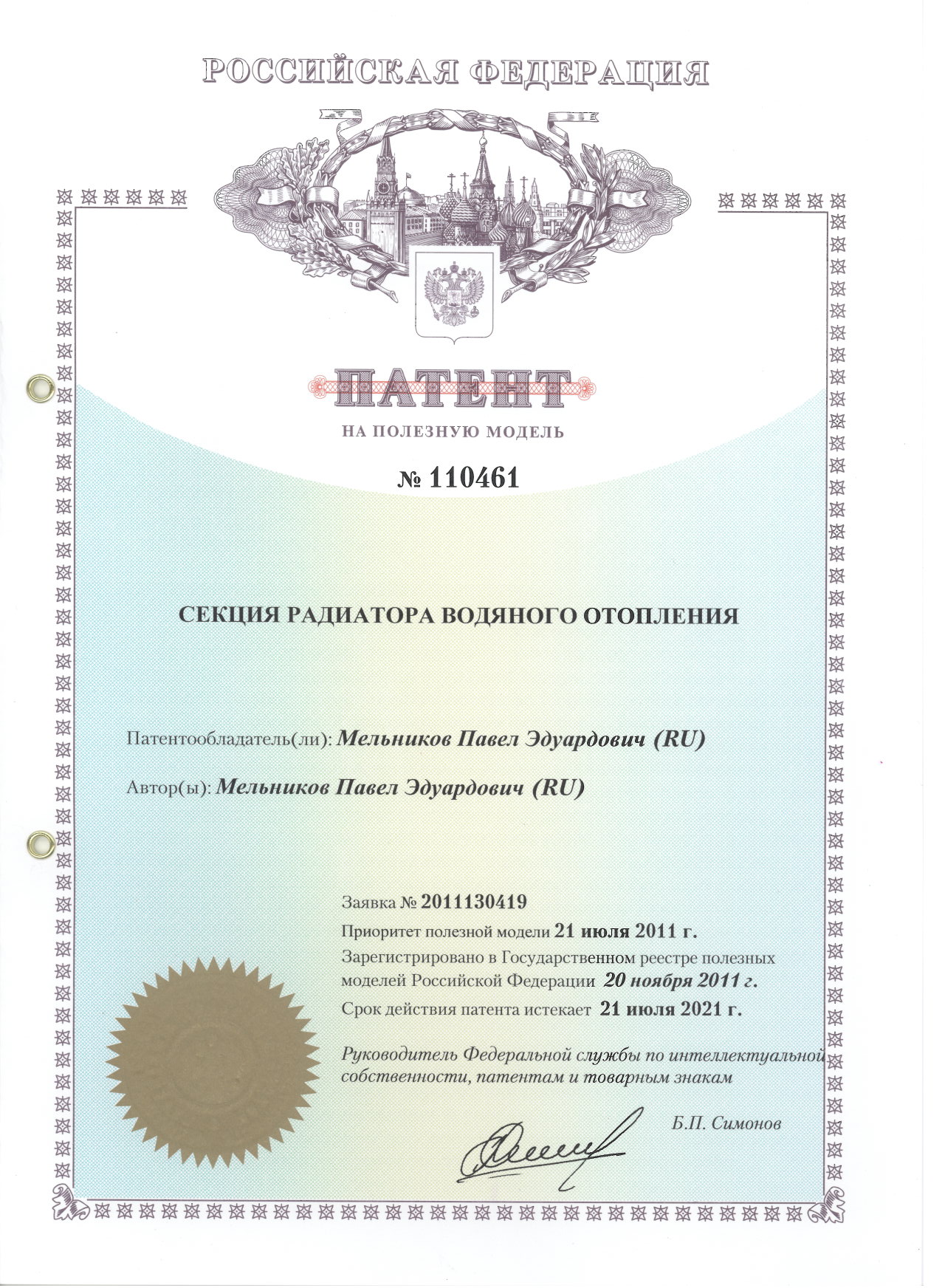 Патент № 110461. Автор: Мельников Павел Эдуардович